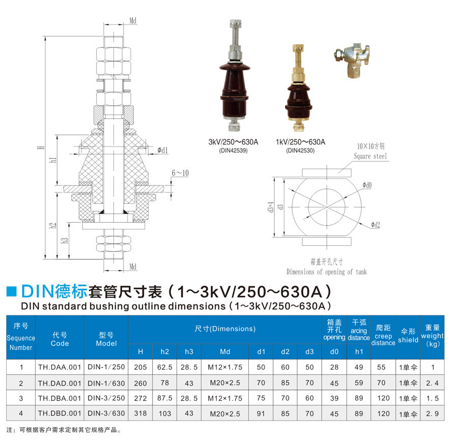 DIN standard bushing 1~3kV/250~630A