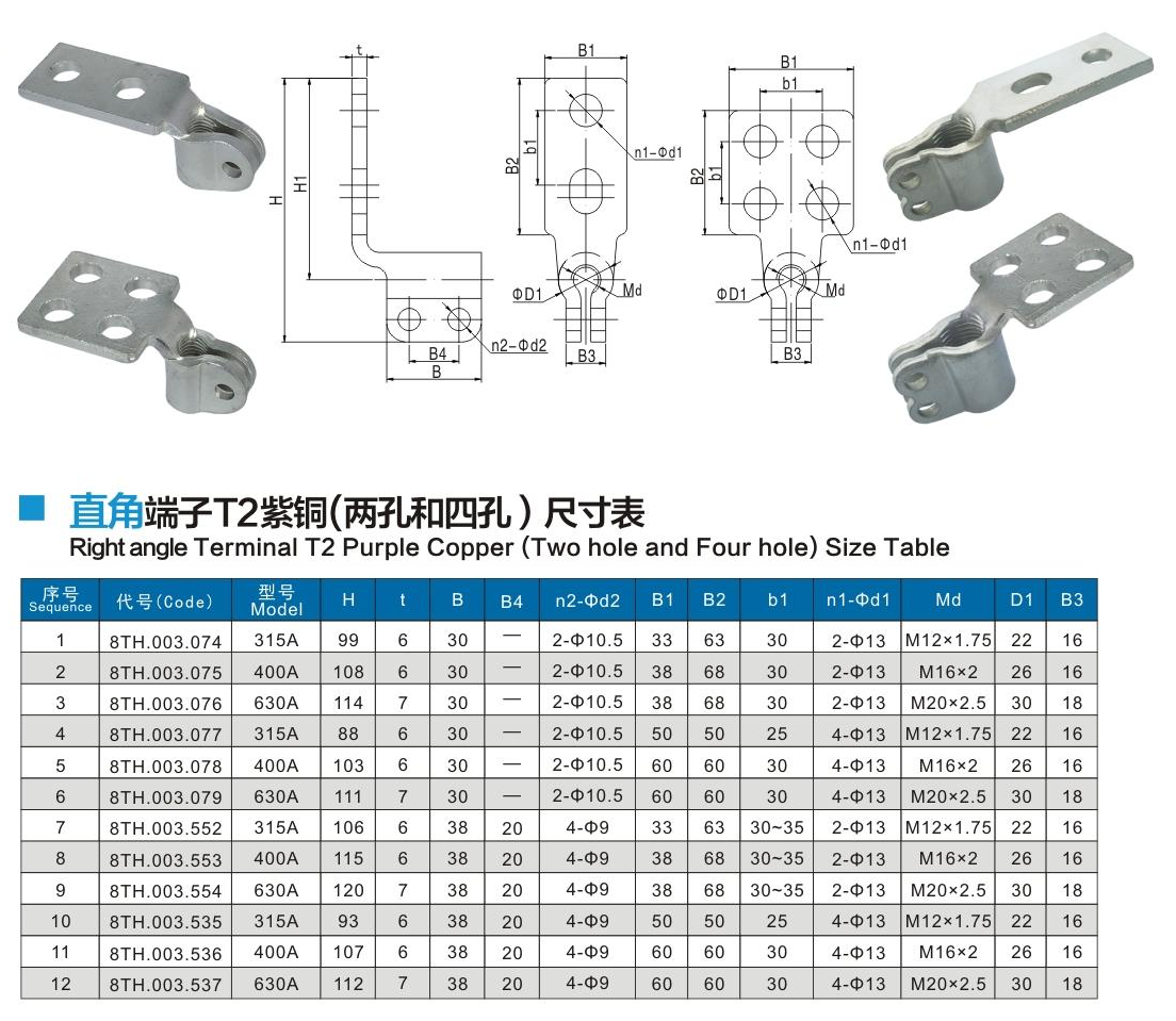 直角端子T2紫銅(兩孔和四孔)
