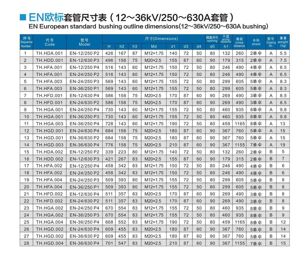 EN歐標(biāo)套管尺寸表12~36kV /250~630A套管